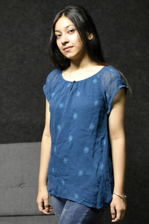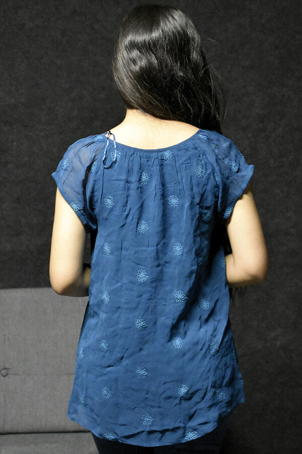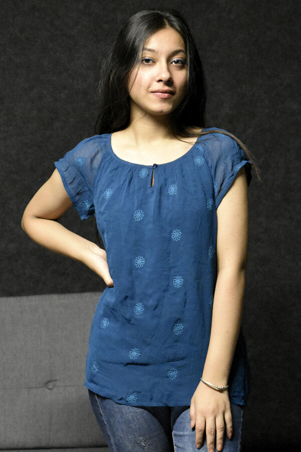Casual Blue Embroidered Cap Sleeve Top